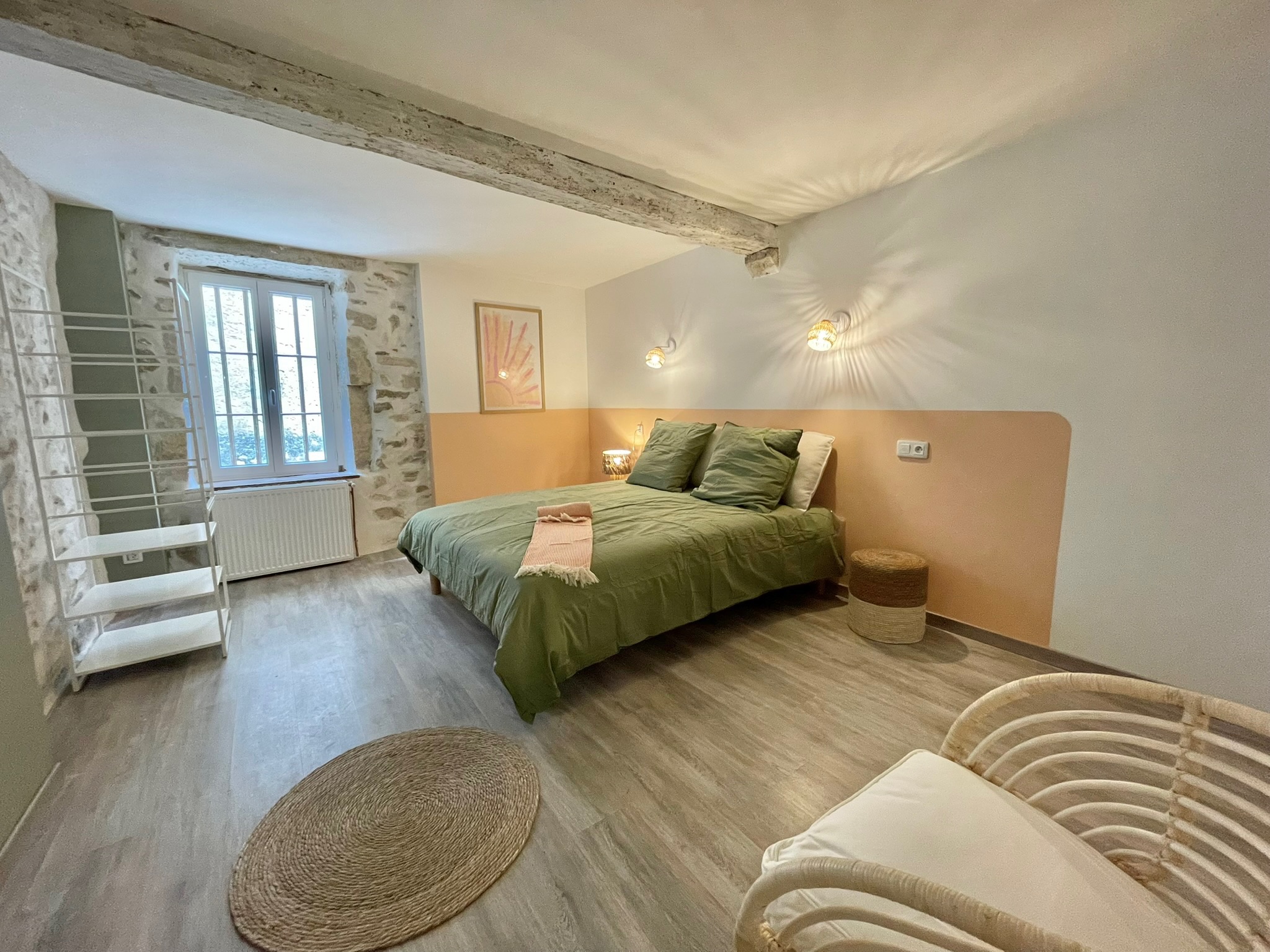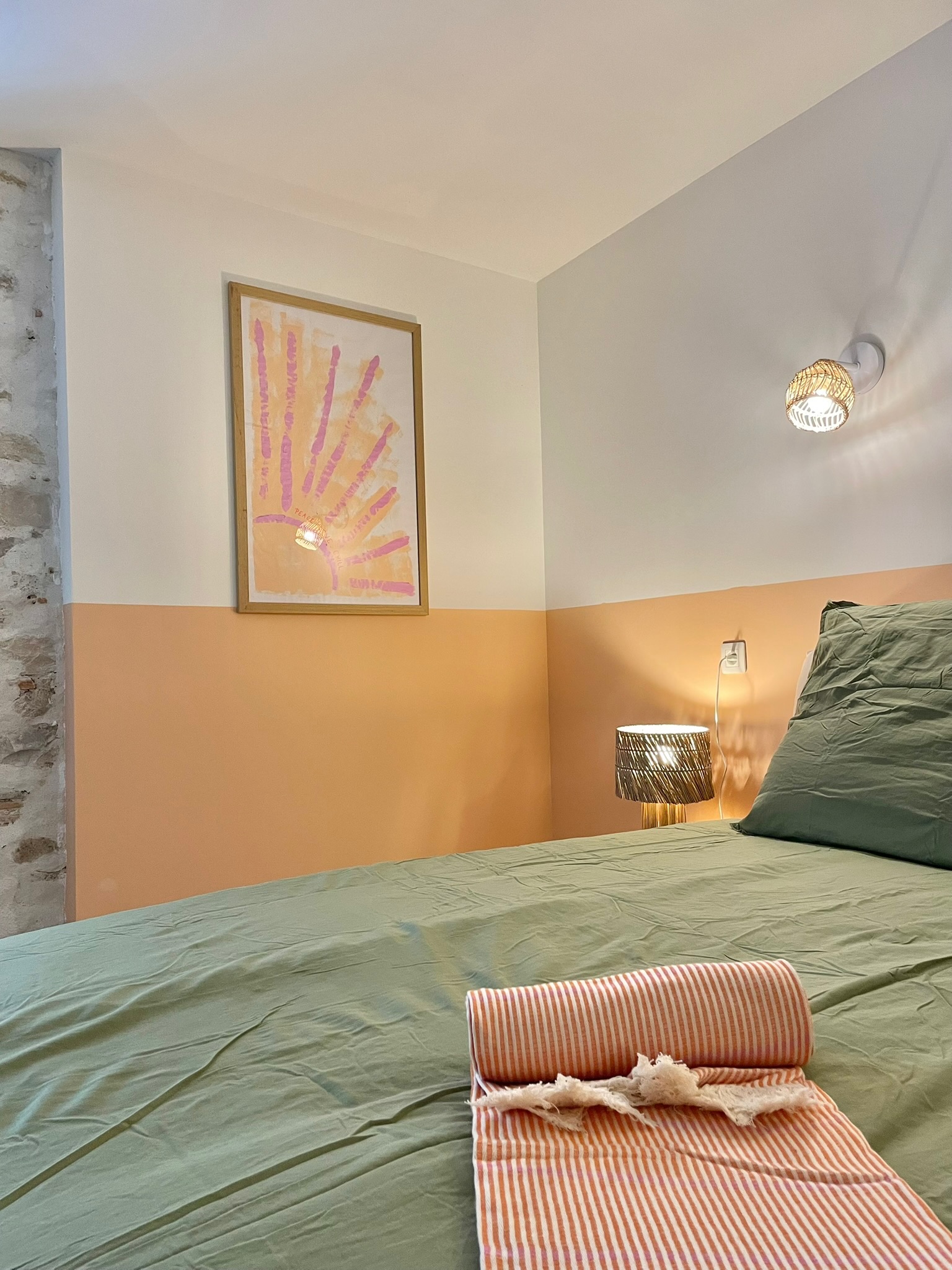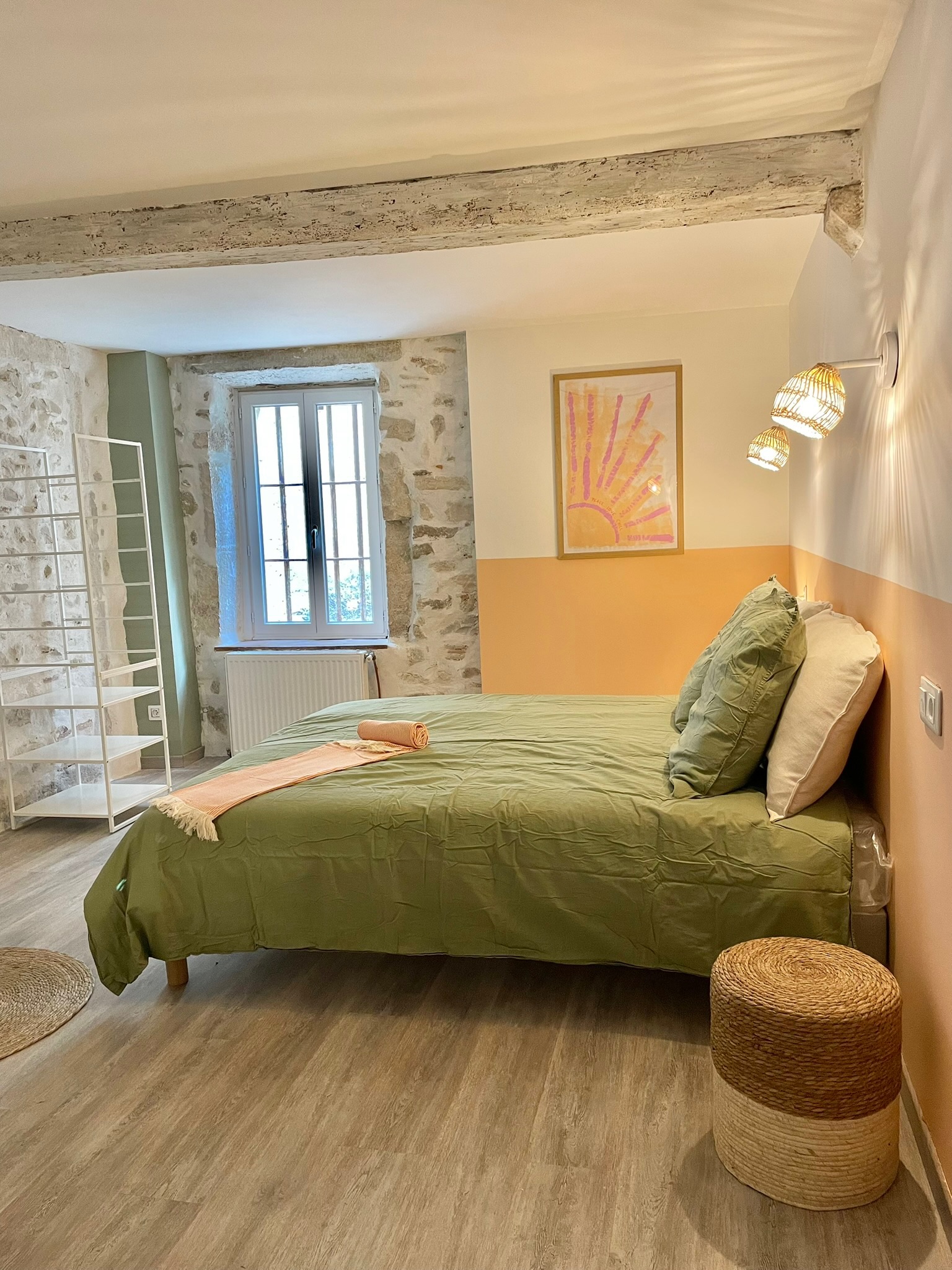 Ici nous vous accueillons dans la suite Good vibes, située en rez-de-chaussée et composée de deux pièces : une chambre et un salon privé. Les murs abricot doux, les textiles kaki et les pierres anciennes offrent une ambiance chaleureuse et ancrée. Le canapé-lit confortable (avec vrai matelas) permet d’accueillir deux autres voyageurs ou d’alterner repos et lecture. Elle comprend un lit double 160×200, une salle d’eau privative avec douche à l’italienne, des WC indépendants et une TV écran plat. Idéale pour un séjour long, une petite famille ou deux ami·es, cette suite mêle charme, espace et sérénité.